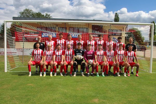 Hinten stehend von links: Co-Trainer Jochen Full, Markus Büttner, Valentin Feulner, Sebastian Barth, Felix Ankenbrand, Spielertrainer Danny Möhring, Mykhailo Potylitsyn, Michael Pfister, Jan Kaiser, Vorstand Sport Janik Full